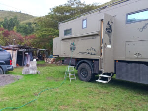 Da wir morgen weiterfahren wollen steht der heute Tag ganz im Sinne des Aufräumens. Allerdings macht uns das Wetter erst Mal einen Strich durch die Rechnung, da es stark regnet. Glücklicherweise klart das Wetter zu Mittag hin auf, und wir können mit dem trocknen und Einräumen unserer Sachen beginnen. Der Regen hat auch seine guten Seiten, den der ganze Dreck auf unserem Dach ist aufgeweicht und lässt sich mit den Gartenschlauch prima runterspritzen. Die Beta und Fahrräder sind auch von Staub befreit, so dass ich wenig Mühe habe diese zu putzen. Glücklicherweise sind alle Ausrüstungsgegenstände, die auf der Hebebühne lagen, trocken geblieben und so kann ich gleich mit dem Verstauen der Beta und der Fahrräder beginnen. Am späten Nachmittag ist auch die Markise trocken und ich kann diese einfahren. Da wir heute Abend noch ein letztes Malim Restaurant essen, kann ich auch die Tische und Stühle verstauen. Da ich die Ladeanordnung unsere großen Garage komplett neu gemacht habe, passen nun auch die zwei zusätzlichen Campingstühle, die uns Thomas geschenkt hat, locker rein. Silvia und Berd begleiten uns zum Abendessen und wir reden über unsere weiteren Pläne. Nachdem das letzte Bier getrunken ist, können wir auch unsere Rechnung bezahlen. Wir schaffen es gerade noch zurück zum MANle, als es wieder zu regnen beginnt.