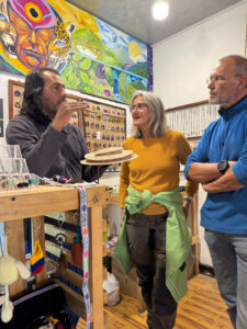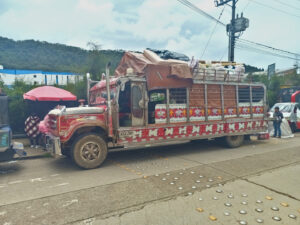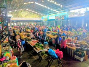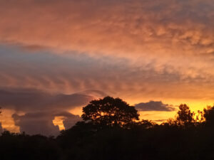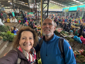 In der Nacht entlädt sich eine gewaltige Gewitterzelle über uns und Blitz und Donner kommen in sehr kurzen Abständen. Zora kriecht fast in mich rein und sucht Schutz bei mir. Es regnet die gesamte Nacht und am Morgen ist in unserem Wasserbottich fast 10cm Wasserstand. Wir haben uns auf 09:00 Uhr mit Kika zum Stadtbesuch verabredet. Anour fährt ins mit dem Pickup in die Stadt und dank Kika finden wir uns in der Stadt gut zurecht. Sie kennt viele der Händler und so können wir alle Dinge kaufen, die wir benötigen. Wir laufen den gesamten Markt ab, um uns alles anzuschauen. Die Obst- u. Gemüsevielfalt ist gewaltig und alles ist richtig frisch. Auch wo es die besten Empanadas weiß Kita. Wir bestellen welche zum Mitnehmen und holen diese am Ende unseres Stadtbesuchs ab. Kita bring uns zu einem Souvenirshop wo wir eine Erklärung über die indigenen Volksgruppen und die Bedeutung deren Kleidung bekommen. Susanne findet die handgemachten Taschen toll und so erwerben eine in den Naturfarben. Für den Rückweg nehmen wir den Bus, doch wir müssen ca. eine halbe Stunde warten, denn der nächste Bus ist bereits ausgebucht. Wir verbringen die Wartezeit in einen Bäckerladen und genehmigen uns kleine Süßspeisen. Und weil die so gut sind, nehme ich gleich noch einige für den Nachhauseweg mit. Am Nachmittag laufen wir zum Fluss, das sind nur 800m. Allerdings geht es steil bergab und der Weg ist rutschig von vielen Regen. Da es auch weiterhin nach Regen aussieht laufen wir zurück. Susannes Fuß soll nicht zu sehr belastet werden. Zora war zu faul, um mitzulaufen und hat es sich lieber auf unserer Filzmatte unter dem MANle bequem gemacht. Bidusha ist auch hier und belagert unseren Teppich unter dem Tisch. Wir starten die Zubereitung des Abendessens und nutzen die regenfreie Zeit so lange wie möglich. Da auf den Regen verlass ist müssen wir rein ins MANle als es Dunkel wir. Zora liegt im trockenen unter dem MANle und bleibt lieber draußen. Bidusha geht nach Hause auf Ihre Matte und bleibt so auch trocken. Die Sonne verabschiedet sich spektakulär.