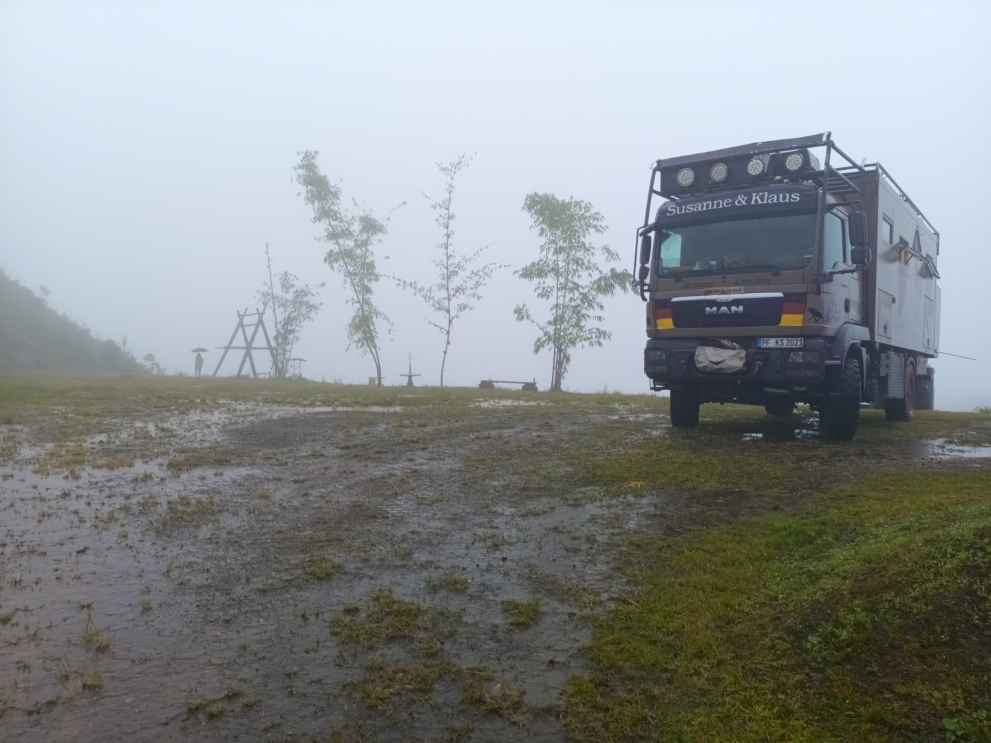 Nach einer recht ruhigen Nacht mit ein wenig Brandungsgeräusch sind wir schnell reisefertig. Es regnet ununterbrochen und so findet die Abfahrtskontrolle in strömenden Regen statt. Unser Ziel ist nun Cuenca, aber das schaffen wir nicht an einem Tag. Daher hoffen wir auf der Strecke etwas Passendes zu finden. Doch zuerst gilt es die Stadt Guayaquil zu umfahren. Hier müssen wir die passenden Brücken finden, was gar nicht so einfach ist. Denn es gibt nur eine Brücke, die für den Schwerlastverkehr zugelassen ist, und die nimmt das Navi garantiert nicht. Schilder, die darauf hinweisen gibt es sowieso keine und am besten ist es einfach den LKW´s zu folgen. Das klappt dann auch ganz gut und wir sind schnell auf der richtigen Route. Es regnet ununterbrochen weiter und rechts und links der Straße sind weite Teile des Landes überschwemmt. In den kleinen Ortschaften ist es nicht besser, da steht das Wasser teilweise in den Häusern. Die großen Bananenplantagen pumpen mit riesigen Pumpen das Wasser aus den Feldern direkt in die Straßengräben. Dort läuft es bis in die Dörfer und verschlimmern die Situation noch zusätzlich. Wir können nur darauf achten, dass wir beim Durchfahren der vielen Wasserläufe keine Personen oder Mopedfahrer nassspritzen. Das tun die LKW-Fahrer hier nicht und schon gar nicht die Busfahrer. Teilweise haben die Mopedfahrer echt zu kämpfen, das sie nicht vom Moped gespült werden. Nachdem wir die Stadt hinter uns gelassen haben, geht es langsam in die Berge. Ab Cochancay steigt die E40 deutlich an und zu dem Regen kommt starker Nebel hinzu. Susanne findet über Google Satellit einen Mirador bei dem auch ein recht großer Parkplatz hinter einem Gebäude ist. Diesen fahren wir an und wir können hier tatsächlich gut stehen. Allerdings sieht das nach einer Partymeile aus. Doch da es sehr stark regnet, erwarten wir hier nicht noch weitere Gäste. Allerdings wohnt hier eine Familie und schalten Ihre bunten LED-Lichter ein. Doch diese sind durch den dichten Nebel kaum zu sehen. Selbst Zora will nicht vors MANle und verkrümelt sich auf das Bett. Späte am Abend kommt der Besitzer des Anwesens und weis uns darauf hin, dass dies Privatgelände ist. Doch er heißt uns willkommen und wir hoffen morgen ein paar Worte mit Ihm reden zu können.