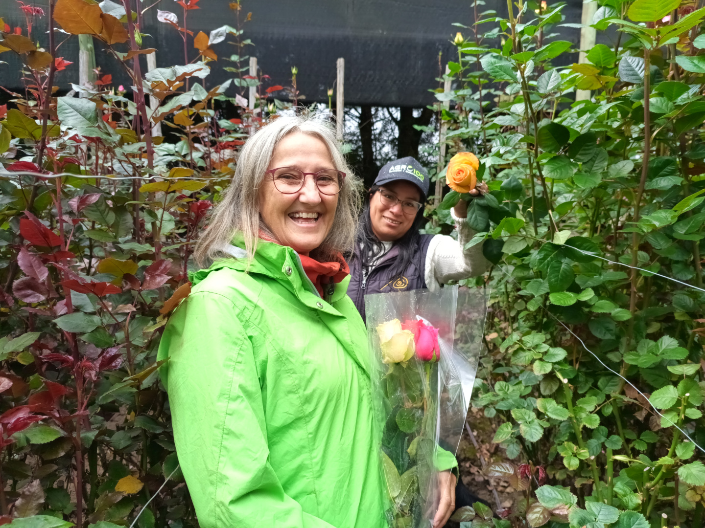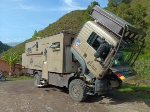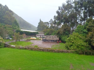 Der Tag erwacht freundlich und so gehen wir früh los, um den Rio Pisque zu erkunden. Wir haben etwas Anlaufschwierigkeiten, denn die vielen Hunde hier machen Zora Angst und sie will nicht raus. Nach etwas hin und her können wir sie aber doch überzeugen mit uns zu kommen. Nur ein Hund begleitet uns zum Fluss. Nach kurzer Zeit haben sich Zora und er angefreundet und gehen gemeinsam auf Tour. Als wir zurück sind, klappe ich das Fahrerhaus hoch und ziehe alle Schrauben noch einmal mit dem Drehmomentschlüssel nach. Alles ist fest und so können wir unbeschwert weiterfahren. Anschließend geht es noch runter zum Baden im warmem Wasser. Doch das keine heiße Beken ist gnadenlos von Einheimischen überfüllt. Zwar ist auch das große Becken etwas warm, doch richtig Spaß macht das, bei 14°C Außentemperatur nicht. Daher gehen wir recht schnell wieder zurück zum MANle. Wir haben uns einen Wanderweg ausgesucht, der über eine Piste anzufahren ist. Doch leider können wir diesen auch mit mehreren Anläufen nicht anfahren. Die Wege sind zu schmal und schlammig für das MANle. So drehen wir um und Machen uns auf den Weg zur östlichen Grenze Richtung Kolumbien. Wir wollen uns etwas im Regenwald des Rio Napo umsehen. Wir stoppen bei einer Rosenfarm, denn hier können wir die Nacht verbringen. Wir machen eine Führung und als wir wieder zurück sind, entlädt sich ein Gewitter mit Starkregen über uns. Unsere eh schon matschiger Stellplatz versinkt nun vollends im Matsch. Das wird morgen wieder eine Nummer, bis wir draußen sind. Da wir eh schräg stehen und es keinen Sinn macht auf die Bretter zu fahren, lasse ich die Luft aus den linken Reifen, um das MANle einigermaßen auszurichten. Die Luft muss morgen eh raus, sonst kommen wir hier nicht weg. Heute Abend ist mal wieder die Indoor-Küche in Betrieb. Da wir viel gefahren sind, sind die Batterien voll und wir können auch drinnen mit dem Induktionsfeld Kochen. Die mobilen Ventilatoren transportieren Fett und Dampf nach draußen. Susanne macht Blumenkohl mit Sahnesoße und ich bereite die panierten Schnitzel vor. Dazu gibt es frischen Salat und so ist das ein super Abendessen. So geht der Tag mit strömendem Regen in die Nacht über. Als wir schlafen gehen regnet es immer noch.