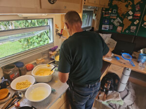 Heute hat der Regen eine neue Dimension erreicht. Schon früh fängt es an zu regnen und hört bis in die frühen Abendstunden nicht mehr auf. So sind wir im MANle gefangen und beginnen unsere Sachen für den heutigen Abend aufzuräumen. Susanne fährt mit John zur Physiotherapie und ist fast zwei Stunden weg. Als sie zurück ist beginnen wir unsere Rollladen und die Soße herzurichten. Wir lassen diese gut eine Stunde bei sehr niedere Hitze in der Pfanne schmoren. Als unsere Gäste eintreffen, gebe ich Butter in die Pfanne und lasse die Spätzle darin warm werden. Tatsächlich haben wir noch fünf Teller, Gabeln und Messer. Susanne und Lina trinken Rotwein und auch dafür haben wir passende Gläser. Jorge und ich trinken Bier aus der Dose und Emma will nur ein Glas Wasser. So haben wir auch mit den Gläsern keine Not. Das Essen ist etwas komplett Neues für Lina und Jorge. Doch alle sind sehr angetan vom Essen und die Teller sind schnell leer. Wir gönnen uns im Anschluss noch ein Eis. Auch Zora ist von den Spätzlen mit Soße angetan und der Napf ist blitzblank geschleckt. Da Emma sehr früh aufstehen muss um in die Schule zu gehen verabschieden Sie sich früh und geht zurück. Lina und Jorge bleiben etwas länger und wir sprechen viel über unsere Reiseerlebnisse. Auch heute Abend lernen wir viel über die kolumbianische Kultur und den Kaffeeanbau. So geht der Abend viel schneller zu Ende als wir uns das wünschen, doch Lina und Jorge müssen morgen Arbeiten und wollen im Anschluss mit Ihrem Campinganhänger auch auf Tour gehen. Dafür gibt es wohl noch einiges zur richten und so haben die beiden noch etwas Arbeit vor sich. Sie laden uns ein mit Ihnen zu fahren, doch da Susanne noch nicht ins Fahrerhaus des MANle steigen kann, müssen wir das leider verschieben. Aber Sie schicken uns Bilder und klären für uns ab, ob wir den Weg auch fahren können. Nach dem alle gegangen sind, erledigen wir gemeinsam den Abwasch. Auch diese Aufgaben machen müde und so gehen wir früh zu Bett. Zora hat sich den Bauch mit Spätzlen vollgeschlagen und schläft schon selig. Natürlich auf meinem Kissen. Ich lasse sie Schlafen und lege micheinfach daneben. Die würzige Soße zwingt sie eh bald aufzustehen und Ihren Durst zu stillen. Das ist meine Changs meinen abgestammten Platz einzunehmen.