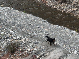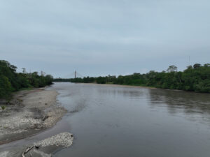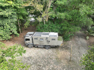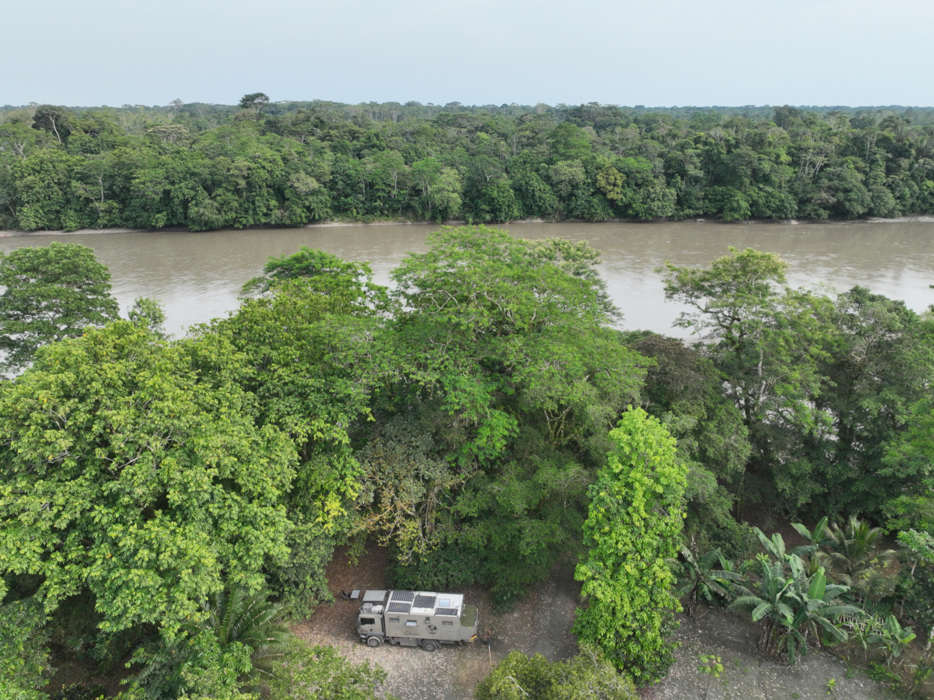Zora und ich nutzen die Morgenstunden, um noch einmal am Rio Salado entlangzuwandern. Für Zora ist das hier eine echte Freude. Sie geht weit voraus und hat den Schalk im Nacken. Die Vögel am Fluss zu fotografieren ist mit Ihr unmöglich. Sie vertreibt alle. Hier kann Sie ohne Stress durch andere Hunde herumschnüffeln. Doch nach einer guten halben stunde beginnt es zu tröpfeln und das kann ich nun schon gut einschätzen. Das geht nämlich in einen ausgewachsenen Landregen über. Daher machen wir uns auf den Rückweg und erreichen das MANle gerade noch rechtzeitig. Nachdem Susanne mit Ihrer Gymnastik fertig ist, rüsten wir das MANle für die Weiterfahrt. Bis Puerto El armen Del Putumayo an der kolumbianischen Grenze sind es noch 302 Kilometer und das wollen wir in zwei Tagen schaffen. Die E35 ist von nun ab mit vielen Baustellen unterbrochen. Über teilweise abenteuerliche Umleitungen müssen wir uns den Weg suchen. Doch ab der Abzweigung auf die E10 wird es deutlich besser. Noch einmal geht es über viele Kurven nach oben, bis es dann nur noch bergab geht. Fast kontinuierlich ist die Motorbremse aktiv. Als wir auf die E45 stoßen, sind wir nur noch 440m hoch. Und die Straße folgt dem Rio Aguarico. Mit nun wenig Biegungen und leichten Gefälle geht es nun weiter zur Stadt Nueva Loja. Hier wollen wir die Nacht auf der Finca D Moma verbringen. Auch hier ist die Straße offiziell wegen Brückenbau gesperrt, doch mit dem MANle können wir die Baustellenauffahrt nehmen und kommen so an unser Ziel. Es ist Wochenende und so sind einige lautstarke Gäste auf dem Gelände. Es nervt und daher gehen wir am Fluss entlang auf Wanderschaft. Für Zora ist das sowieso die einzige Option. Da wir heute sehr spät zu Mittag gegessen haben, fällt das Abendessen aus. Als wir zurückkommen, wird es bereits dunkel und unsere Nachbarn haben die Musik ausgeschaltet. Auch hier sind die Moskitos eine echte Plage und so gehen wir trotz 25°C rein, um den Plagegeistern zu entfliehen. Wir wollen noch eine Weile recherchieren wie wir am besten eine Tour in das Amazonasgebiet machen können.