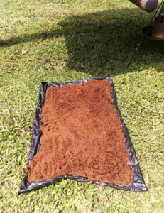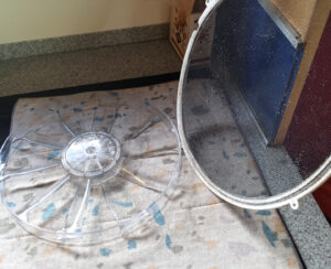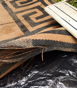 Wir starten in einen regenfreien Vormittag. Die Sonne kommt raus und so räume ich unseren Teppich weg um den Boden darunter zu trocknen. Es bilden sich langsam Matschpfützen vor der Eingangstür und so besorge ich noch etwas Granulat und ebne den Bereich vor der Eingangstür noch etwas ein. Ich mach das etwas höher, damit das Wasser seitlich wegläuft. Als der Boden gut abgetrocknet ist lege ich Folie aus und darüber den Teppich. So läuft das Wasser weg und der Matsch kann nicht durchdrücken. Wenn die Wetterapp mal nicht lügt, soll es auch Morgen trocken bleiben. Der Sonnenschein ist auch gut um neue Kokosfasern für die Trenntoilette zu richten. In der Sonne sind die Fasern nach zwei Stunden trocken. Auch meinen leeren Wassertank fülle ich auf. Durch den Filter läuft nur wenig Wasser und so dauert es sehr lange bis der Tank voll ist. Unser Wasserhahn am Küchenspülbecken leckt nun so stark, dass man fast kein Wasser mehr laufen lassen kann. Daher bekommt er eine Bandage aus Epoxidharz. Auch unsere Dachventilators und das Gitter rufen nach Reinigung. Bisher haben wir nur das obere Gitter verwendet um nicht zu viel Luftwiderstand durch zwei Gitter zu haben. Nun habe ich das obere Gitter demontiert und arbeite nur noch mit dem unteren. Dieses kann ich einfach zum Reinigen rausknipsen. Es wird doch gleich viel heller im Bad. Danach mache ich mich ans Holzhacken. Ich bin zuversichtlich, dass ich bald wieder grillen kann. Doch heute schein das nichts zu werden, denn es ziehen dunkle Gewitterwolken auf. So sehr ich ja den Klang von holperten Bierfässern mag, so nah muss es dann wirklich nicht sein. Auf Blitz folgt direkt Donner. Doch auch das kann in einer Stunde schon wieder ganz anders sein und so hacke ich alles Holz was in der Holzbox ist. Meine nächste Baustelle ist der Teppich der an den Seitenrändern ausgefranzt ist. Alle Kebeversuche scheitern und am Ende ist die einfachste Lösung die beste. Der Teppich ist ja geknüpft und so kann ich die Enden einfach zusammenbinden. Da sich schon gut 5 cm des Teppichs verabschiedet haben sind die Fäden lang genug damit ich sie verknoten kann. Das ist aber eine sehr mühsame Arbeit und so mache ich jeden Tag nun nur ein kleines Stück. Er rennt mir ja nicht weg. Bis Ende der Woche werde ich die erste Seite fertig haben. Der Tag vergeht schnell und so richte ich mir ein kleines Abendessen. Ich bin müde vom Arbeiten und so verbringe ich den Abend auf der Coach und lese etwas. Zora ist auf Tour, doch beim nächsten Donnerschlag ist sie garantiert wieder hier.