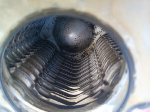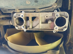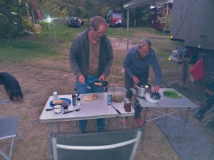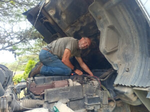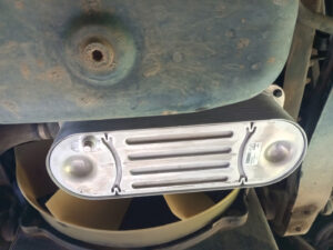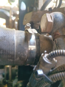 Nachdem mir Herr Motz erklärt hat wo wir zwei weitere Schrauben finden, die noch zu lösen sind, mache ich mich an die Arbeit den alten Hochdruckkühler zu demontieren. Die Schrauben sind allerdings so gut versteckt, dass man sie nicht einmal mit den Fingern auf Anhieb findet. Mit dem Gabelschlüssel aber schon, uns es ist zwar mühsam diese auszudrehen, aber mit Geduld geht auch das. Nachdem diese ausgedreht sind, fällt der Kühler von allein runter. Nun geht es daran die Dichtflächen zu säubern. Da mache ich mit einem Putzflies und gebe mir da richtig Mühe. Mit Thomas Hilfe bringen wir die neuen Dichtungen mit Silikonfett in Position und montieren den neuen Kühler. Das ging besser als gedacht. Die nächste Baustelle ist der neue Thermostat. Die Demontage geht sehr gut von der Hand und bevor wir nun den neuen einbauen, kommt die kleinere Riemenscheibe für die Wasserpumpe dran. Mit demontierten Kühlmittelschlauch und demontierten Thermostatgehäuse kommt man da nämlich viel besser dran. Mit einem Ratschengurt ziehen wir die Spannrolle des Keilriemens zurück, um diesen zu entlasten. Schnell ist die alte Riemenscheibe demontiert und die neue, etwas Kleinere montiert. Anschließend entlasten wir den Ratschengurt und ich prüfe den richtigen Sitz des Riemens. Nun kann ich auch den neuen Thermostat montieren und das Gehäuse wieder festschrauben. Der nächste Schritt ist das Einfüllen des Kühlmittels. Es gehen nur 16 Liter rein und so lasse ich den Motor an, um weitere 4 Liter nachleeren zu können. Nun muss die Probefahrt zeigen ob wieder alles in Ordnung ist. Es ist kurz vor Mittag als wir alle Arbeiten am MANle abgeschlossen haben. Bille möchte einmal um die Lagune laufen und das kommt mir gerade recht. Zora und ich brauchen auch etwas Auslauf. Thomas ist nicht begeistert, geht aber dennoch mit. Unterwegs gönnen wir uns einen leckeren Orangensaft und nach gut 11 Kilometer sind wir wieder zurück. Wir beschließen gemeinsam zu kochen und ich mache Spätzle. Bille hat Medaillons und macht die Soße. und den Salat. Ich steuere noch zwei Koteletts bei und so haben wir ein köstliches Abendessen. Der Tag steckt mir ordentlich in den Knochen und so mache ich noch den Abwasch und gehen anschließend schlafen. Auch Zora ist sehr müde und geht gleich in Bett.