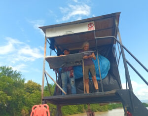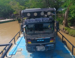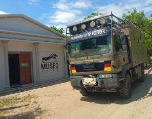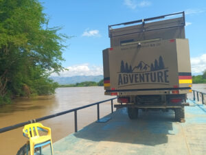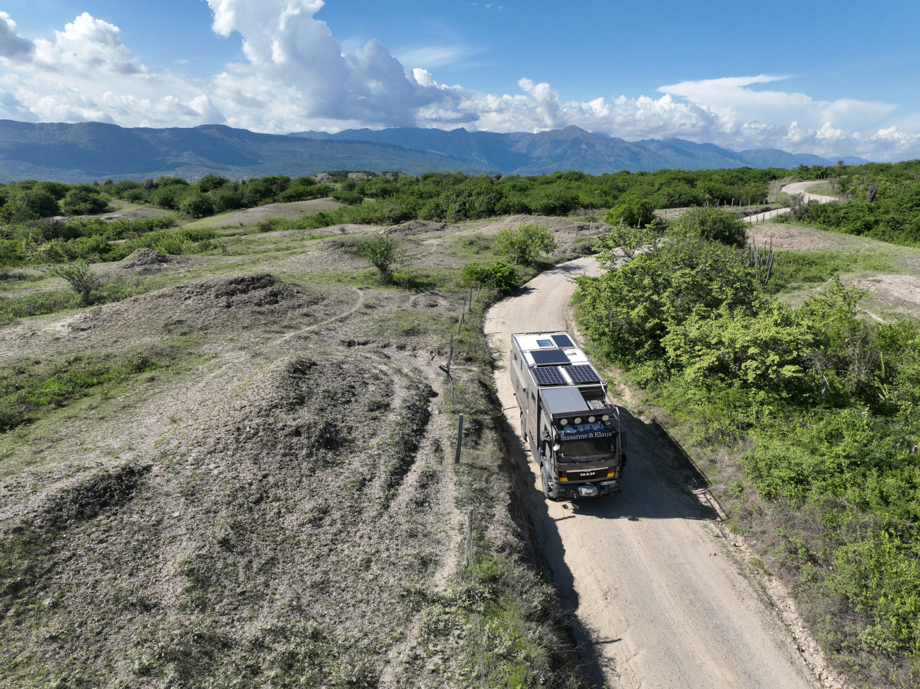 Der Tag begrüßt uns recht freundlich uns so sind wir früh auf den Beinen. Wir wollen heute zur Tatacoa Wüste fahren und daher starten wir früh los. Die Straße bis zur Abzweigung in die Wüste ist oft zweispurig ausgebaut und so kommen wir gut voran. Wir fahren mit stetigem Gefälle auf unter 400 Höhenmeter hinunter. Erst als wir Richtung Fähre fahren wird die Piste schmal und bei Gegenverkehr heißt es eine passende Stelle zu finden. Es gibt hier tatsächlich drei Fähren in unterschiedlicher Größe. Da ist auch was für uns dabei und schnell haben wir den Rio Magdalena überquert. Nun geht es langsam richtig rein in die Wüste. Das Thermometer zeigt 35°C an und wir sind froh um unsere gute Klimaanlage im Fahrerhaus. Wir fahren langsam, denn die Landschaft bietet großartige Fotomotive. In La Viktoria besuchen wir das kleine, aber sehr feine prähistorische Museum. Unser Guide lebt mit samt seiner ganzen Familie für die Ausgrabungen und das Museum hier. Anschließend fahren wir weiter und nehmen die schmale Abzweigung, die uns zu den zu der grauen Wüste führt. Wir folgen gut eine Stunde der schmalen Piste und suchen uns einen schattigen Übernachtungsplatz. Der ist hier draußen leicht zu finden und so können wir uns weit ab von jeglicher Zivilisation mitten in die Wüste stellen. Ich gehe mit Zora auf Erkundungstour in der näheren Umgebung Doch bei der Hitze hat keiner so richtig Lust und daher tauschen wir den Wanderstock gehen kühle Getränke. Es kommen noch drei Esel vorbei und sich recht neugierig. Wir breiten unser Abendessen wieder draußen zu doch da die Mücken hier auf Beutezug sind müssen wir uns schnell rein verkriechen. Dank mobiler Ventilatoren können wir für ordentlich Durchzug sorgen und so die Hitze erträglich machen.
