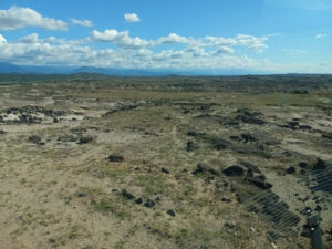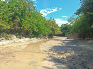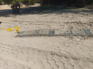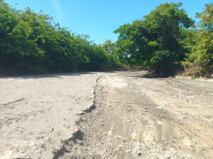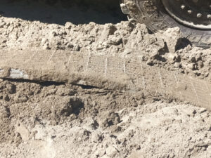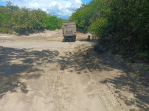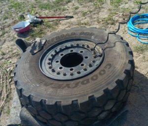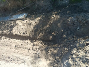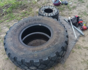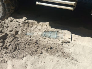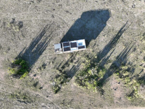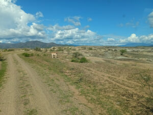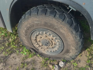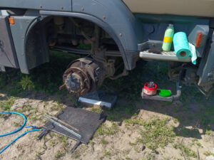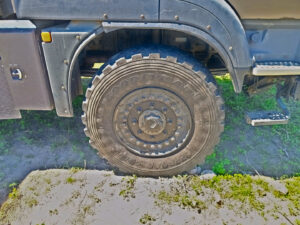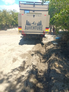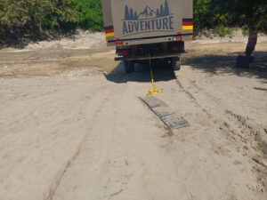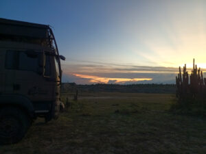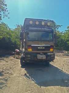 Der Tag startet sehr freundlich und schon früh bin ich aufgestanden, um die Ruhe am Morgen zu genießen. Es ist schon recht warm und so kann ich gut die Eingangstür öffnen. Auch Zora will früh raus, denn das Gelände macht Ihr viel Spaß. Ich geh mit raus und muss feststellen, dass unser rechtes Vorderrad platt ist. Na prima. Schnell finde ich die defekte Stelle und mache mich daran einen Dichtstreifen einzudrehen. Doch etwas hindert mich daran das richtig zu machen. Es hilft alles nichts wir müssen den Reifen flicken. Also demontieren wir den Reifen und dabei wird schnell klar, warum das mit dem Dichtstreifen nicht funktioniert. Es stecket ein ca. 5mm dicker Stahldorn im Mantel. Nachdem ich diesen entfernt habe, teste ich noch einmal einen Dichtstreifen. Dieser lässt sich nun eindrehen wir es sein soll. Doch wir wollen kein Risiko eingehen und wenn wir eh schon die Felge demontiert haben können wir auch gleich einen Dichtpilz einziehen. Vorsorglich reinige ich den Mantel und den Dichtpilz und trage etwas Kleber auf und ziehe den Pilz ein. Dieser hält sofort bombenfest. Schnell ist die Felge wieder zusammengeschraubt und die Luft eingelassen. Nachdem wir festgestellt haben, dass alles dicht ist, montieren wir das Rad und sind reisefertig. Wir duschen uns noch kurz ab, um den Sand und Staub von der Haut zu kriegen. Danach fahren wir los. Leider kommen wir nur 4 Kilometer, denn an einer Flussdurchfahrt versenken wir das MANle im Uferschlamm. Zwar ist die Flussdurchfahrt über einen Betonstreifen gut zu befahren, doch davor ist der Boden extrem weich. Die zu befahrene Stelle ist gut, doch wir sind nun mal etwas breiter und so sinkt das MANle in der schlammigen Uferböschung bis zu zur Achse ein und neigt sich stark auf eine Seite. Sofort lassen wir auf der anderen Seite die Luft aus den Reifen um das MANle vor dem Umkippen zu schützen. Danach geht die große Schauflerei los. Es ist uns nicht möglich das MANle mit den Hebekissen anzuheben. So bleibt uns nur allen Uferschlamm wegzuschippen, damit wir unsere neuen Rampen platzieren können. Vorne geht das ganz gut, aber zwischen den Reifen ist das eine ziemlich kraftraubende Arbeit. Es hält ein weiterer Overlander aus Australien an, um zu helfen. Doch wir sind schon so weit fertig, dass wir das MANle fahren wollen. Tatsächlich fährt sich das MANle über die Rampen frei, auch wenn diese gut 30cm im Uferschlamm versinken. Sie mit der Hand zu bergen ist fast unmöglich, aber wir hängen diese einfach ans MANle und ziehen sie raus. Das geht sehr gut und nachdem wir dies ca. 200 Meter mitgeschleift haben, sind diese auch sehr sauber. Da eine Rampe etwas verbogen ist, fahre ich mit dem MANle ein paar Mal drüber und schon ist sie wieder schön gerade. Ich schiebe die Rampen wieder in Ihre Halterungen und anschließend dusche ich noch mal kurz, um allen Dreck abzuspülen. Der weitere Weg ist ziemlich schmal und rechts und links von tiefen Wasserläufen begrenzt. So muss ich langsam und konzentriert fahren, um das MANle auf der Spur zu halten. Erst als wir zur Abzweigung der Hauptroute kommen, wird die Straße breiter, auch wenn sie immer noch von tiefen Wasserläufen flankiert wird. Da wir sehr viel Zeit verloren haben suchen wir uns einen Schlafplatz. Die Hauptroute ist mit vielen Farmen und keinen Ansiedlungen bestückt und so fahren wir auf eine Nebenroute und suchen uns gut einen Kilometer vom Ort entfernt einen ebenen Platz zum Schlafen. Da die Sandflöhe hier in der Gegend sehr aktiv sind, holen wir unseren Teppich raus und bauen unsere Outdoorküche auf. Zora ist wieder sehr engagiert und geht weite Wege, um die Gegend zu erkunden. Wir haben etwas Wind, der die immer noch über 30°C am Abend etwas angenehmer macht. Der Himmel verfärbt sich Gold und Rot und bietet zum Abschied des Tages einen tollen Ausklang.