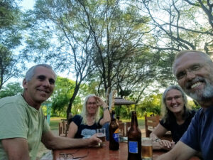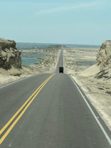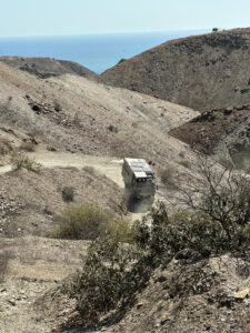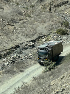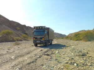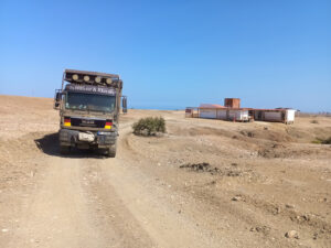 Nachdem die Luft in den Reifen angepasst ist und alles sicher verstaut ist machen wir uns auf den trickreichen Rückweg aus dem Reserva Nacional Illescas. Die Piste ist staubtrocken und bis auf die großen Schlaglöcher ganz gut zu befahren. Die steilen Passagen sind mit Geröll übersät, was etwas Vorsicht verlangt. Auch die engen Serpentinen schaffen wir nicht auf einmal und müssen rangieren. Zum Glück kommen uns keine Fahrzeuge entgegen und so kommen wir gut durch den engen Tunnel. Nachdem wir die sehr gut ausgebaute Pista 04 erreichen, kommen wir gut voran. Auch die N1 zurück Richtung Piura ist sehr gut zu befahren. Der Tempomat steht auf 70km/h und das MANle rollt mit knapp 25l/100km gemütlich vor sich hin. Ab und zu müssen wir einen langsameren LKW überholen, doch das ist auf der bolzengeraden Straße keine Herausforderung. Hier werden große Schiffe auf LKW´s transportiert und da ist es besser, wenn man von der Straße runterfährt. Bremsen können diese Transporte nämlich nicht. In Piura ändert sich das aber gewaltig. Dichter Verkehr unzählige Tuk-tuks und chaotische Verkehrsführungen machen unser Fortkommen schwer. Nach einigen mühevollen Kilometern erreichen wir unser Zeil den Campingplatz Porta Verde. Helga, Susanne und Rainer machen sich auf zu Supermarkt und ich bleibe mit Zora hier, um nötige Kleinarbeiten abzuarbeiten. Wichtig ist mir die Kontrolle des Achsöls. Wenn nichts mehr rausläuft, kann ja auch der Grund sein, dass nichts mehr drin ist. Doch der Ölstand ist korrekt und auch das Motoröl und der Kühlflüssigkeitsstand sind seit der letzten Kontrolle unverändert. Ich reinige die Zuluftfilter und widme mich dann unserem Eingangs Plissee. Zora hat mal wieder etwas zu heftig daran gezogen und es aus den doppelten Klebeband gezogen. Das ist aber schnell geheilt und so müssen die Moskitos wieder draußen bleiben. Als die Einkaufstruppe zurückkommt, sind auch ein paar neue Crocs für mich dabei. Die alten fliegen sofort in den Müll. Alle gemeinsam gehen wir eine kurze Runde schwimmen und anschließend ins Restaurant zum Abendessen. Als wir zurückkommen, ist die Moskitos Armada zu heftig, um draußen zu sitzen. Daher gehen wir alle rein, um uns auszuruhen. Der Tag war anstrengend und daher gehen wir müde ist Bett.