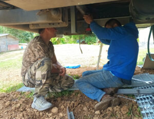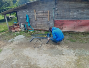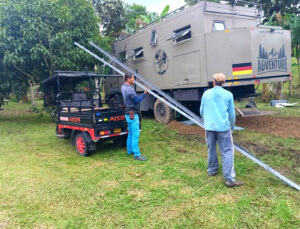 Für heute haben wir mit Jorge verabredet die Halterungen für die Sandrampen zu bauen. Hierfür kommt Canguro zu uns um diese hier herzustellen. Ich kenne Ihn gut, da er mit Jorge und mir die Offroadtour mit dem Motorrad gemacht hat. Als erstes fahren wir in die Stadt um Material und Ausrüstung zu kaufen. Wir kaufen Winkelprofile und Schweißelektroden. Trennscheiben für die Flex und passende Schrauben und Muttern gehören auch dazu. Ein TukTuk bringt die 6m langen Winkelprofile zum MANle. Nachdem wir alles haben fahren auch wir zurück. Wir haben mit dem Wetter glück und es bleibt bis zum späten Nachmittag trocken. Noch einmal suchen wir die beste Lösung für die Lagerung der Rampen unter dem MANle. Doch letztlich bleiben wir bei der ursprünglich geplanten Variante. Wir erstellen ein Lochmuster aus Holz für die Befestigungsschrauben am Chassis. Da wollen wir keinen Millimeter Schlupf haben. Mit je zwei M12er Schrauben werden die 6mm starken Winkelprofile nun sicherhalten. Schnell haben wir die Profile auf die richtigen längen abgeflext und auch die Löcher sind dank Holzdummy schnell gebohrt. Mein Schraubstock leistet uns dabei einen guten Dienst. Wir prüfen alle Halterungen ob sie auch wirklich passen und markieren dieses dann. Nun geht es darum die Gleitschienen für die Rampen anzuschweißen. Diese sind ja 6cm hoch, doch wir wollen etwas mehr Luft lassen, denn diese werden ja nicht gerade bleiben. So lassen wir einen Abstand von 10 cm. Nachdem die Halterungen fertig sind, beginnt es auch schon an zu regnen. Daher verschieben wir die restlichen Arbeiten auf morgen. Das Arbeiten macht durstig und so gönnen wir uns ein Feierabendbier. Da wir die Rampen besser verschweißen wollen, muss Canguro noch andere Schweißelektroden besorgen. So kann ich aber morgen mit dem reinigen der Profile und dem Streichen beginnen. Das wird sicherlich den gesamten Tag in Anspruch nehmen. Susanne putz den gesamten Tag fleißig weiter im MANle. Sie will morgen mit John in die Wäscherei und auch Einkaufen fahren. Daher hat sie die gesamte Bettwäsche zusammengerichtet und alles vorbereitet. Am Abend macht sie leckere Schinkennudeln für uns. Dafür muss man Zora nicht zweimal rufen.