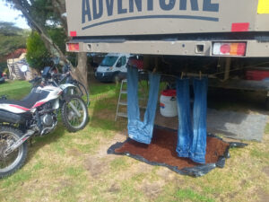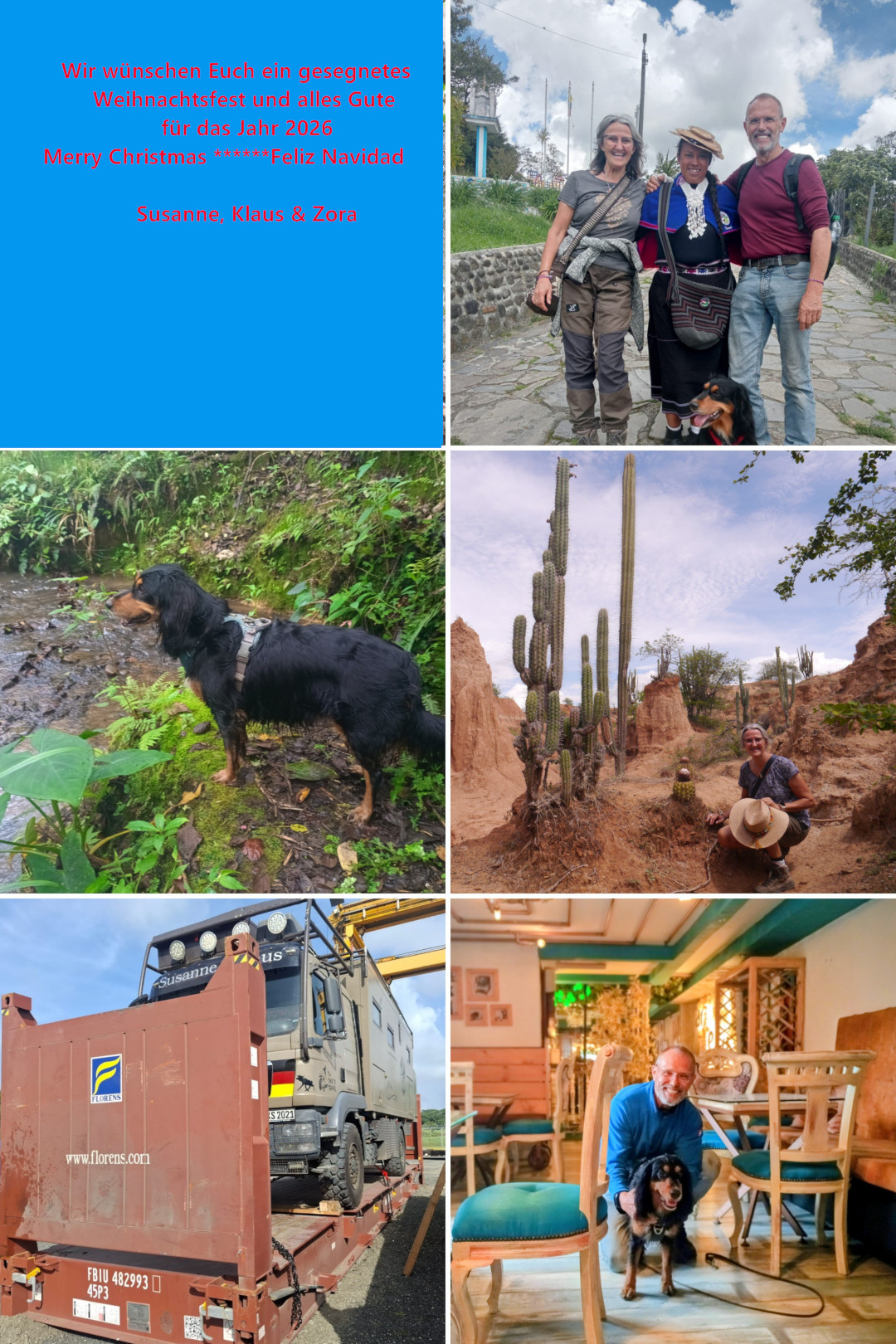 Wieder einmal sind meine Jeans ziemlich mitgenommen und schreien nach der Waschmaschine. Doch vorher bekommen sie eine Einzelbehandlung mit Seife und Bürste. Energie und Wasser sind hier kein Thema und so können wir gut mit unser eigenen Waschmaschine waschen. Susanne fährt mit Elke und Alex zur 35 Kilometer entfernten Stadt Otavalo. Sie wollen dort den Kleidermarkt besuchen. Zora und ich haben von Städten genug und bleiben lieber hier. Es gibt genug zu tun. Da das Wetter etwas sonnig ist kann ich auch gleich neue Kokosfasern für unsere Trenntoilette richten. Es kommt ein kolumbianisches Ehepaar mit Ihrem Hund Bruno. Zora freundet sich gleich mit Ihm an und die beiden spielen schön miteinander. Natürlich bleibt Susannes Marktbesuch nicht ohne Folgen und so schmückt nun eine neue Decke unsere Betten. Zora findet diese große Wolldecke auch Klasse und kuschelt sich darin ein. Um die Jeans zu trocken befestige ich zwei Wäscheleinen unter der Hebebühne. So können sie gut trocknen und werden bei Regen nicht nass. Es ist auch an der Zeit unsere Weihnachtsgrußkarte zu erstellen. Das erledige ich auch gleich mit. Heute haben wir beschlossen wieder für uns zu kochen und nicht unten im Restaurant zu essen. Wir haben noch Schweinekoteletts und dazu gibt es Chayote. Die Chayote schmeckt etwas wie Kohlrabi und wird auch so zubereitet. So kommen nun auch zum ersten Mal unsere neuen Teller zum Einsatz. Nach dem Essen gehen wir runter ins Restaurant und trinken noch ein feines Bier vom Fass. Norbert, Elke u. Axel gesellen sich zu uns. So geht auch dieser Abend in trauter Runde zu Ende. Zora hat mit Bruno getobt und ist müde. Sie liegt gleich in die Koje und schläft schnell tief und fest.