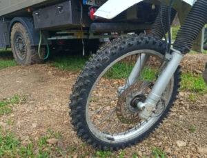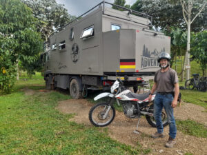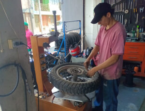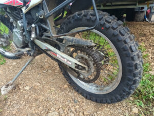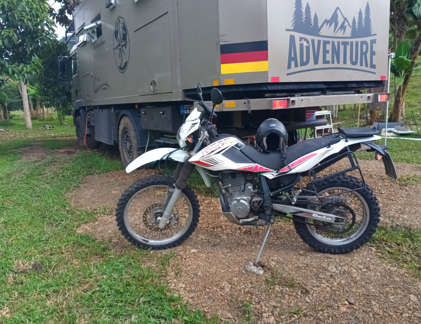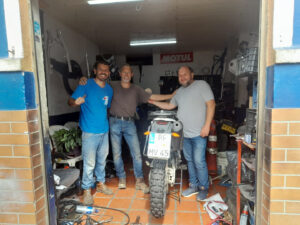 Schon früh kommt heute früh Canguro mit der neuen Halterung für den Beta Lenker. War die alte Platte aus 4 mm starkem Aluminium, ist die neue nun aus 6mm starkem Edelstrahl. Mit etwas Anpassungsarbeit kann ich die neue Platte befestigen und auch der Lenker hält nun bombenfest. Ich habe beschlossen, dass die Beta neue Motocross Reifen bekommen soll. Daher fährt Canguro nach Pereira und besorgt mir passende Reifen. Als er zurück kommt fahren wir zum Reifenwechsel in seine Werkstatt. Dort bauen wir di Räder aus und tragen sie 50m die Straße hoch zum Reifenwechsel. Hier gibt es eine professionelle Reifenmontiermaschine und schnell sind die Reifen gewechselt. Da der Schlauch des hinteren Reifens nicht mehr gut aussieht tauschen wir diesen vorsorglich aus. Schnell sind die Räder wieder eingebaut und die Beta läuft nun auf artgerechten Sohlen. Schon auf dem großen Schotterplatz ist der Unterschied deutlich spürbar. Musste ich mit den alten Reifen die Beta immer etwas auf Kurs zwingen, läuft sie nun wie auf Schienen. Ich fahre anschließend einkaufen und muss hierzu unterschiedliche Supermärkte anfahren, denn die Einkaufsliste ist lang und speziell. Doch ich kenne mich mittlerweile ganz gut in der Stadt aus und so weiß ich wo ich mein Moped abstellen kann und wie ich am besten fahre. Als ich zurück bin starte ich unser Vakuumiergerät und vakuumiere unser Fleisch und die Karotten, da es somit besser haltbar ist. Da unsere Seitentasche der Beta nach unserem Sturz eine gerissene Befestigungslasche hat, nehme ich Nadel und Faden zur Hand und nähe die Lasche wieder an. Ich habe Salat und Grillhähnchen mitgebracht und so ist das Abendessen schnell erledigt.